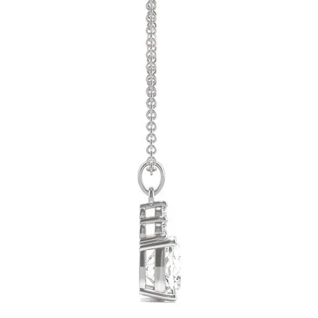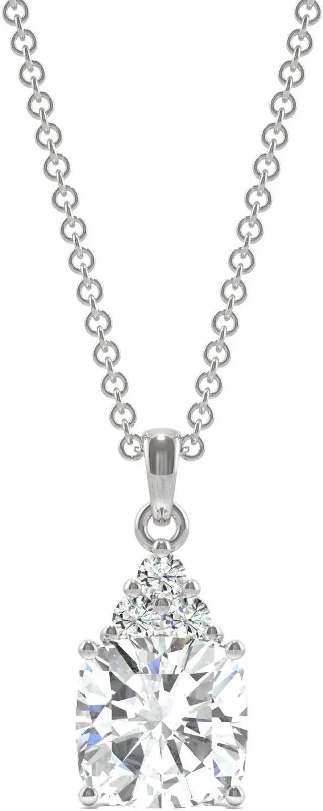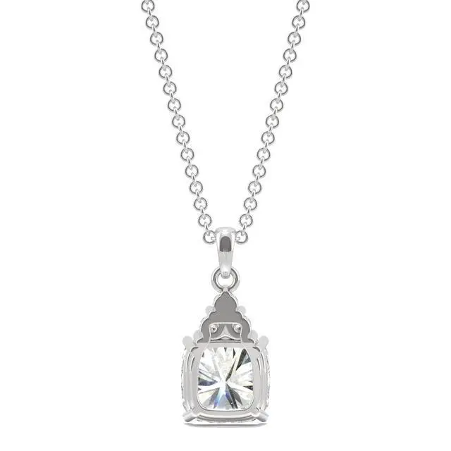 This charming pendant necklace showcases a 7mm cushion brilliant cut Moissanite by Charles & Colvard gemstone. Beautifully crafted in rhodium plated 14K white gold and secured in a four prong setting. The Total Diamond Equivalent Weight (DEW) is 1.79cttw (Actual Weight 1.58cttw).