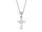 This charming cross pendant necklace showcases six 2.5mm round brilliant cut moissanite gemstones. Beautifully crafted in rhodium-plated 14K white gold, suspended from a 16-inch chain with a 2-inch extender, and secured in a shared prong setting. The pendant has a Diamond Equivalent Weight (DEW) of 0.36ct (Actual Weight 0.30ct). The cross is approximately 8.9mm x 11.4mm.