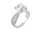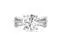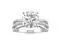 This beautiful engagement ring showcases a 9mm round brilliant cut Moissanite by Charles & Colvard gemstone. Beautifully crafted in rhodium plated 14K white gold and secured in a four prong setting. Ring size 7. The Total Diamond Equivalent Weight (DEW) is 2.90cttw (Actual Weight 2.42cttw).
