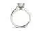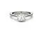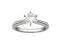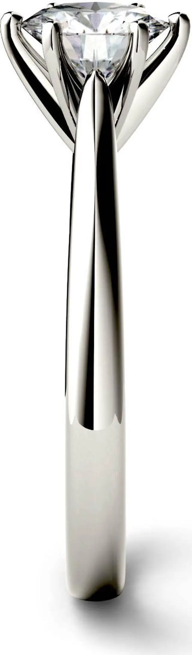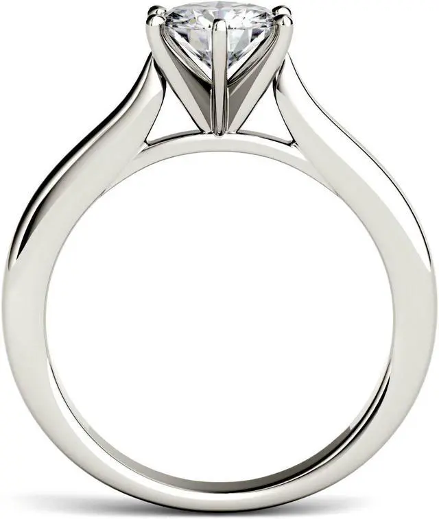 This glamorous Moissanite by Charles & Colvard solitaire engagement ring showcases a 6.5mm round brilliant cut moissanite gemstone. Beautifully crafted in rhodium-plated 14K white gold and secured in a six-prong setting. The width of the band at the narrowest point is approximately 1.44mm and the width of the band at its widest point is approximately 2.65mm. Ring size 7. The Total Diamond Equivalent Weight (DEW) is 1.00ct (Actual Weight 0.88ct).