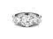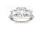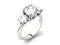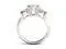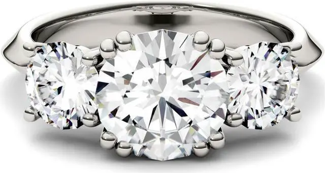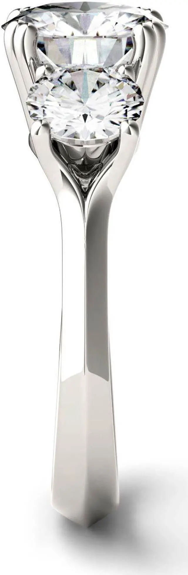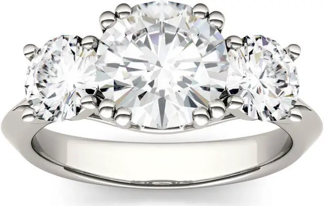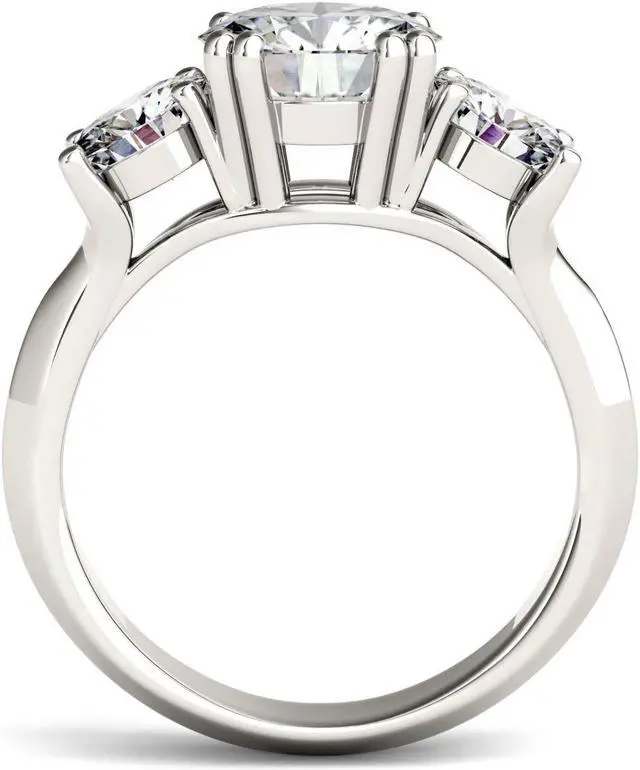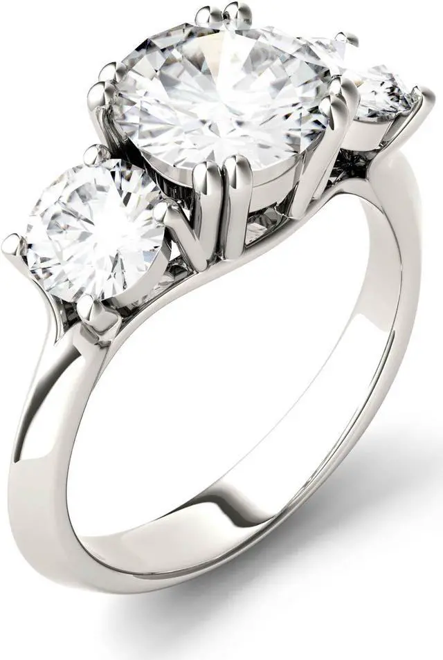 This charming engagement ring showcases an 8mm and two 5.5mm round brilliant cut Moissanite by Charles & Colvard gemstones. Beautifully crafted in rhodium-plated 14K white gold and secured in a four-prong setting. The width of the band at its narrowest point is approximately 2.1mm and the width of the band at its widest point is approximately 2.6mm. Ring size 5. The Total Diamond Equivalent Weight (DEW) is 3.10cttw (Actual Weight 2.68cttw).