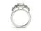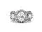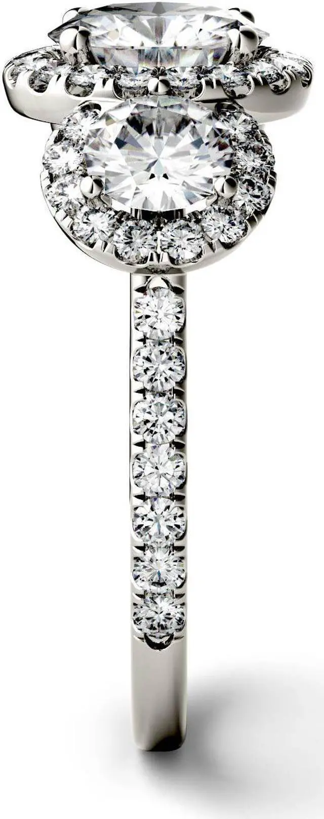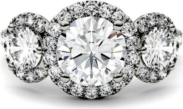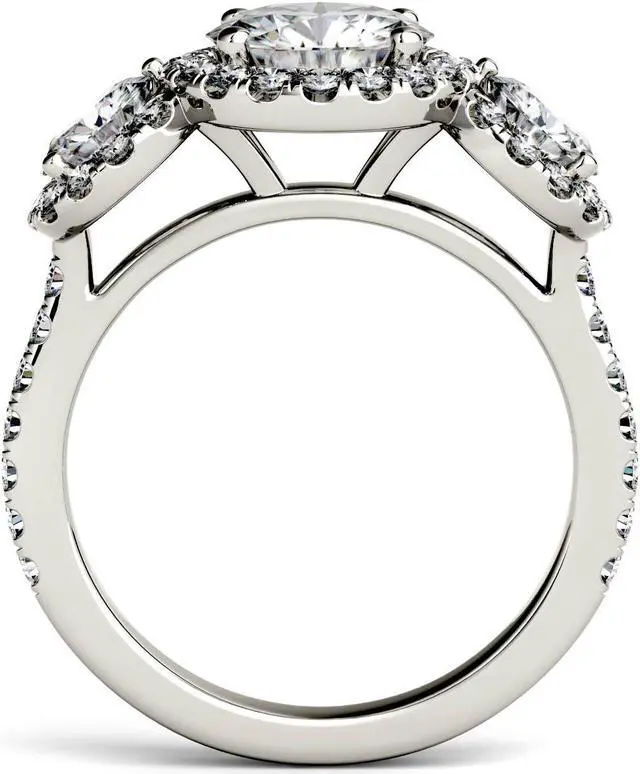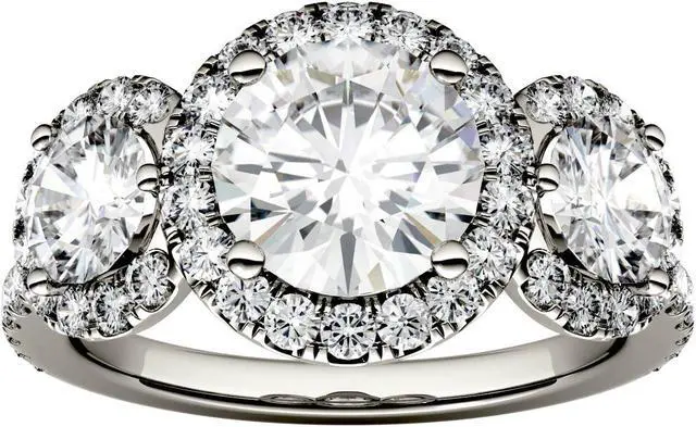 This glamourous triple halo engagement ring showcases a 7.5mm round brilliant cut Moissanite by Charles & Colvard gemstone between two 5mm round moissanite gemstones. Each of these three stones are impeccably enveloped by a halo of moissanite accent stones. Additional moissanite accent stones line the shoulders for a high-shine finish. Beautifully crafted in rhodium plated 14K white gold and secured in a four-prong setting. Ring size 6. The Total Diamond Equivalent Weight (DEW) is 3.09cttw (Actual Weight 2.61cttw).