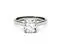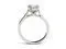 This gorgeous engagement ring showcases a 7.5mm cushion brilliant-cut Moissanite by Charles & Colvard gemstone. Beautifully crafted in rhodium plated 14K white gold and secured in a four-prong setting. The width of the band at its narrowest point is approximately 1.45mm. The width of the band at its widest point is approximately 2.33mm. Ring size 9. The Total Diamond Equivalent Weight (DEW) is 2.00ct (Actual Weight 1.80ct).