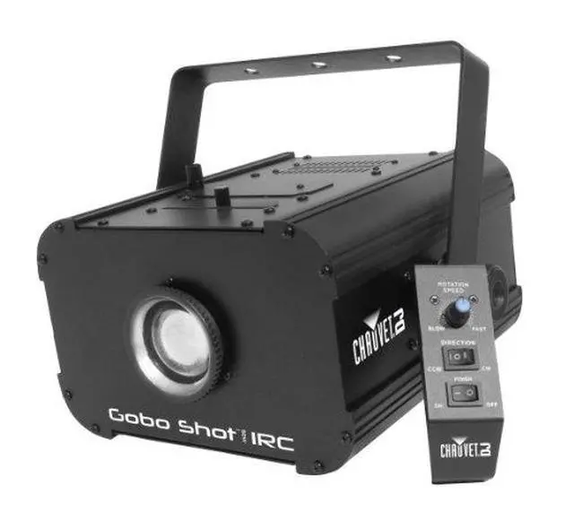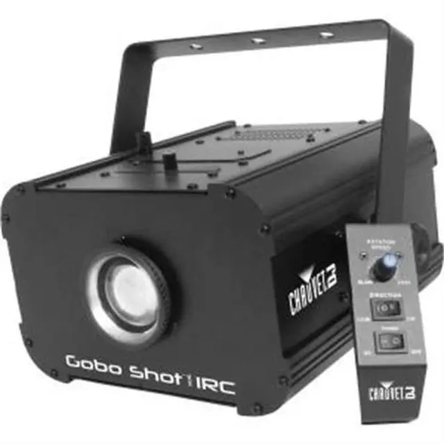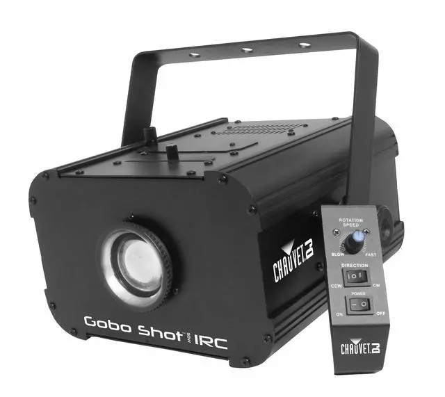 Gobo Shot 50W IRC is a powerful, DMX-controllable gobo projector powered by a 50-watt LED. It features a hinged gobo door for quick, easy gobo changes and includes 10 popular gobos and a gel frame holder. For customized looks, easy to change, size D gobos allow for greater projected details. Heat-free LED power allows for use of custom gobos printed on transparency film. Use the built-in digital display or optional IRC remote to control the dimmer function as well as gobo rotation and direction. Gobo Shot™ 50W IRC fits best in the optional CHS-40 VIP Gear Bag for secure and convenient transportation.