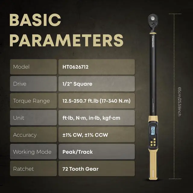 Smart Alerts and Pro-grade Durability: Engineered for 1/2" digital torque wrench that surpass standards. Buzzer and LED warnings trigger at target values. 4140 Chromoly Steel ratchet head for durability; ergonomic handle cuts fatigue and enhances usability