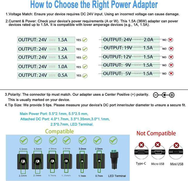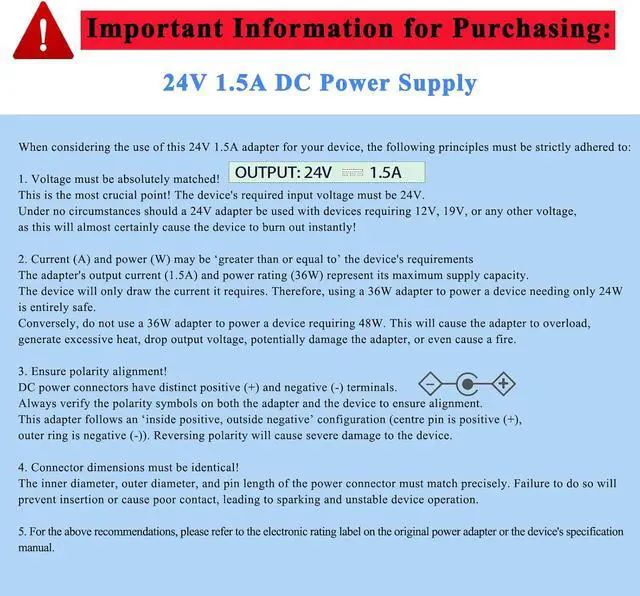 2. Current (A) and power (W) may be greater than or equal to the device's requirements. The adapter's output current ( 1.5A ) and power rating (36W) represent its maximum supply capacity. The device will only draw the current it requires. Therefore using a 36W adapter to power a device needing only 24W is entirely safe. The reverse is not acceptable. 3. DC Port Polarity must be consistent!