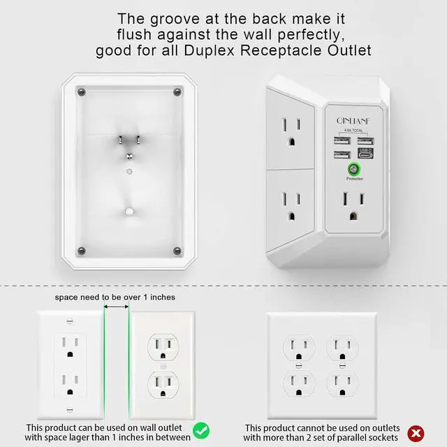 Note: this works on duplex outlet only other types of outlet like GFCI outlet cannot be secured onto the wall. Best Ideal Stocking Stuffers for Adults. The Groove Design on The Back and Wide space - 5 AC outlets with 2.1 inches long space in between larger than standard 1.5 -inch socket. Larger spacing makes it easier to use for all kinds of equipment. The groove at the back make it flush against the wall perfectly good for all Duplex Receptacle Outlet.