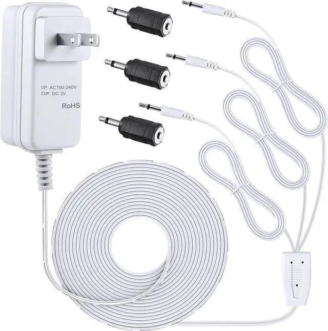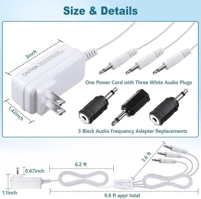 White Cables: the white DC cord is 9.8 ft long totally longer than many other cords; And the power cord is divided into 3 cables from the location of about 6.2 ft connecting 3 white audio power plugs with 2.5 mm diameter3 Replaceable Black