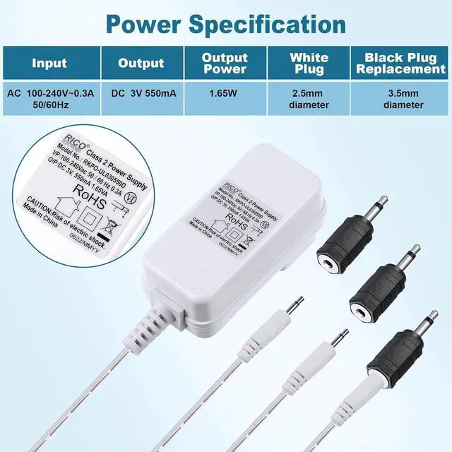 Output: 3V/ 550mA DC 1.65W maxLong DC Cord Divided into 3