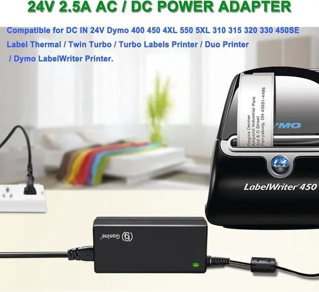 [Universal Compatibility & Perfect Fit] The Gonine 24V 2.5A power adapter is specifically designed as a direct replacement for a wide range of Dymo LabelWriter printers. It is fully compatible with models like the 4XL 5XL 400 450 550 Twin Turbo and Duo seamlessly replacing original power cords (e. g. P/N 1752267 1752266). [Stable & Reliable 60W Power Output] With a maximum power of 60W and a stable DC 24V output this adapter provides consistent and sufficient power for your label printer. It is compatible with devices requiring 1.5A 1.75A 2A and 2.5A ensuring optimal performance and preventing damage due to power inconsistencies.