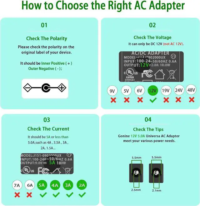PLEASE NOTE: It is NOT compatible with devices requiring 19V or 19.5V input. Always verify your original power supply's voltage and DC port size before purchase. [Stable & Powerful Output] Delivers a stable DC output of 12V and up to 5A current with a maximum power of 60W. It seamlessly replaces original 12V 5A 4A 3A and 2A power adapters ensuring your device receives consistent and adequate power for optimal performance. [Convenient Design & Specifications] Features a standard 5.5 mm x 2.5 mm DC plug. The power cord offers great flexibility with a 1.2 -meter ( 3.9 ft) AC cable and a longer 1.5 -meter ( 4.9 ft) DC cable allowing for easier setup and placement. [Premium Safety Features] Built with multiple advanced protections including Automatic Overload Cut-off Over-Current Over-Voltage and Short-Circuit Protection. Certified by FCC CE and RoHS it ensures complete safety for both you and your electronic devices offering peace of mind during use.