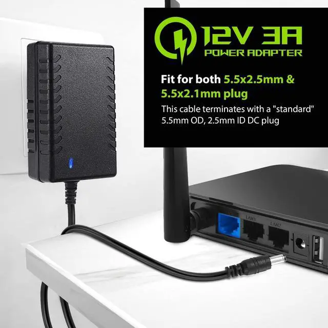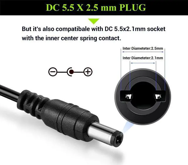 Output: DC 12V/3A (3000mA). With a 150cm ( 4.92 feet) Total Length Cable you don't have to worry about your devices can not being placed too far from the socket. Indoor use only! Plug Design-- Fit for both 5.5 x 2.5 mm & 5.5 x 2.1 mm plug. This cable terminates with a standard 5.5 mm OD 2.5 mm ID DC plug but it's also compatible with DC 5.5 x 2.1 mm socket with the inner center spring contact.