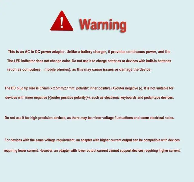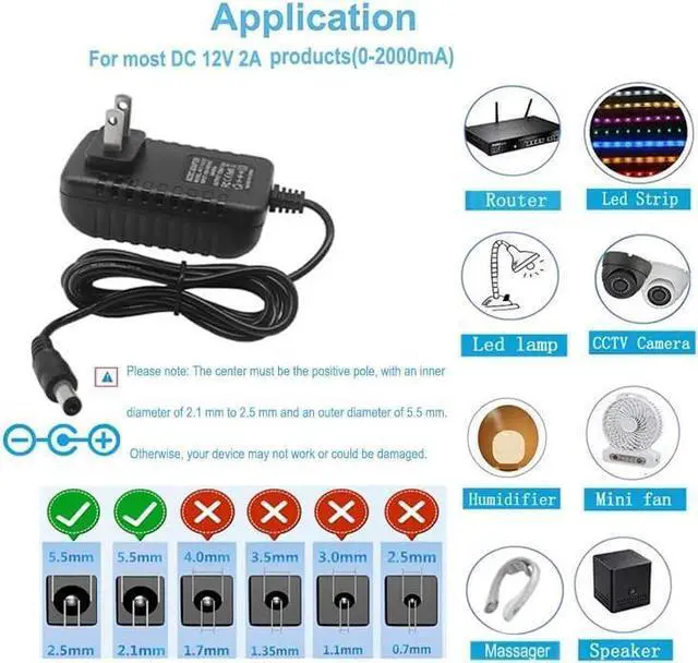 Power cord length: 4.6 ft/ 1.4 m. Please check the DC socket type power consumption (must not exceed the Max output of the adapter) polarity of the device before ordering or it may cause problem or damage the device. DC 12V 2A is a constant voltage adapter widely applied to CCTV Cameras LED strip light BT speakers GPS webcam USB-HUB router TV Box home phone system recorder scanner DVR hard disk box WS2811 LED pixel light DIY projects and more 12V dc household electronics less thanless than 24W.