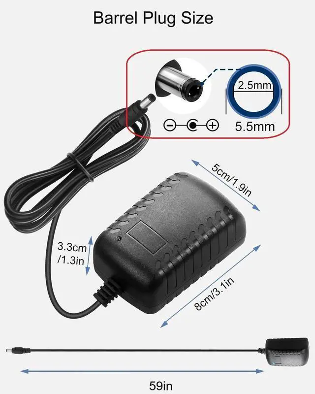 Input: 100V-240V 50/60Hz; Works with device that draws less than 2A such as 12V 1A 12V 1.5A 12V 2ADC 12V Power Cord with DC Plug size is 5.5 mm x 2.5 mm. E. g. DC output port outer diameter is 5.5 mm inner diameter is 2.5 mm. Please kindly confirm it before ordering.