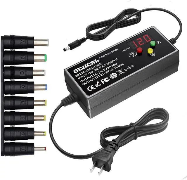 Output: DC 5~24V Adjustable Max 3A 60W; It can supply with any voltage between 5-24V such as 5V 5.5V 6V 9V 12V 13.5V 15V 16V 18V 19V 20V 24V etc and any amp less than 3A such as 300mA 500mA 650mA 1A 1.5A 3A. LCD display will show the output voltage in case that wrong voltage regulation damage your deviceSafety DesignBuilt-in protruding 3 button for adjusting the voltage suitable for your device the LED displays real-time voltage which helps you control real-time condition of power supplying. Built-in multiple safety protection systems. Automatic over voltage cut-off over current cut-off over temperature cut-off short circuit cut-off. No noise no spontaneous combustion no explosion no fire hazard safe to use8PCS Frequently DC TipsIt comes with an original 5.5 x 2.5 mm tip (compatible 5.5 x 2.1 mm)and 8pcs frequently used plugs: 6.0 x 4.0 mm 6.3 x 3.0 mm 5.5 x 2.5 mm 5.5 x 2.1 mm 5.5 x 1.7 mm 4.7 x 1.7 mm 4.0 x 1.7 mm 3.5 x 1.35 mm. All-in-one universal power supply replaces lots of single tip or single volt dc power adapter cords you can save a lot of buying different voltage ac adaptersWidely Used60W 3A all-in-one multipurpose universal switching power adapter fit for many 5-24V home electronics such as LED strips under-cabinet light TV Box smart speaks wireless routers USB fan hard disk box DC motor Table Lamp DC pump digital photo frame etcNotice: LCD display will show the output voltage in case that wrong voltage regulation damage your device. Please choose correct voltage before plug it to your device. Wrong voltage may damage your device.