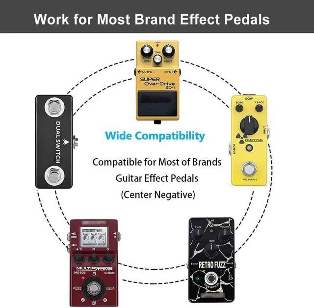 Cord Length: 4.92 ft/ 1.5 mPrecise plug-in IC chip component designed provides excellent anti-interference & noise reduction performanceMade of premium PVC + low impedance pure copper wire ensures you a quiet pedal condition while you playThis pedal power adapter can work with most of 9V tip-negative guitar pedal with the exact voltage requirements. It is compatible with most brands effects pedals
