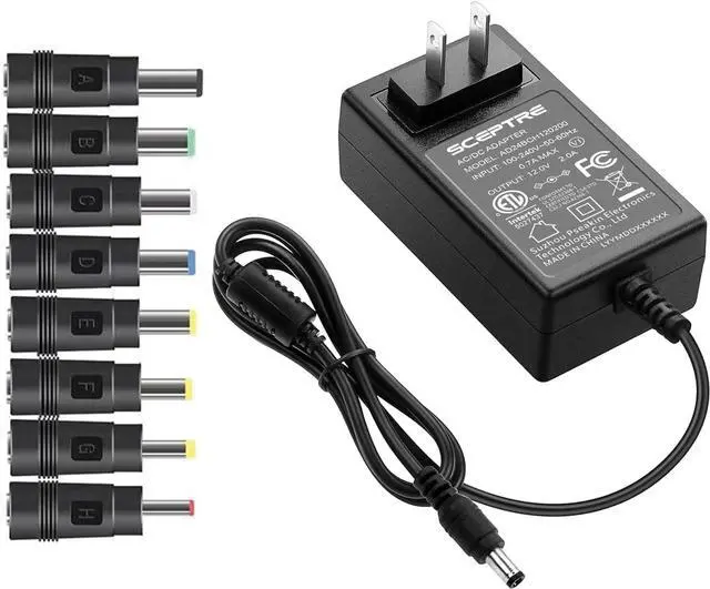 Intelligent Compatibility: Featuring an industry-standard 5.5 x 2.1 mm barrel connector and an included set of 8 tips this adapter ensures seamless compatibility with various devices from Sceptre monitors to Echo smart speakers webcams routers mini PCs projectors CCTV cameras and Bluetooth speakers. ETL Certified Safety Under UL Standards: Meets stringent safety standards ensuring reliable performance and protection against overcurrent overvoltage and short-circuit conditions.