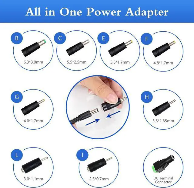 9pcs Frequently Used Tips: Comes with an original 5.5 x 2.1 mm plug and 9pcs frequently used tips: 5.5 x 2.5 mm 6.3 x 3.0 mm 5.5 x 1.7 mm 4.8 x 1.7 mm 4.0 x 1.7 mm 3.5 x 1.35 mm 3.0 x 1.1 mm 2.5 x 0.7 mmterminal connector. Polarity is internal + outside-. This 9-in-1 5V 1A universal power adapter kit greatly expands its application scope. And 9 different tips can fit various devices with different DC connector polarity and size. You can easily switch between the tips without soldering or cutting wires. Please reconfirm the DC jack size before purchase and use to ensure compatibility.