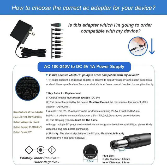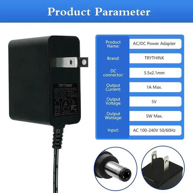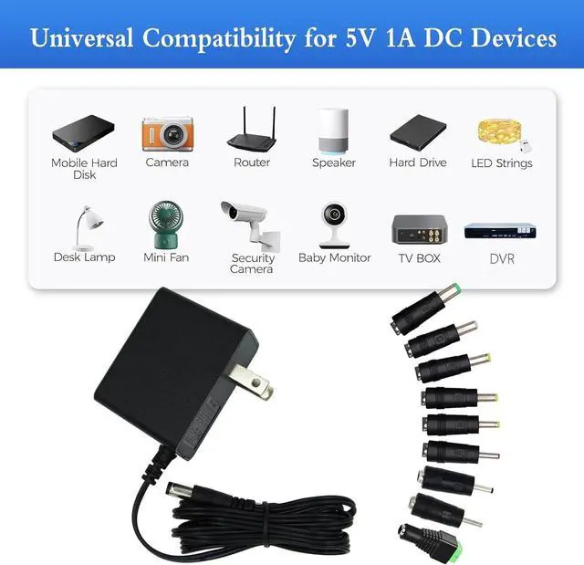 Wide Application: 5V 1A power adapter would meet your 90% power need for 5V household and office electronics. Perfect for games consoles Router electronic refrigerator LCD monitor LED strip lighting communications equipment audio portable bluetooth mini fan and video products security computer case GPS DVR webcam speaker CCTV and the other digital products which require 5.5 * 2.1 mm plug and other 5v devices less than 5WSafety