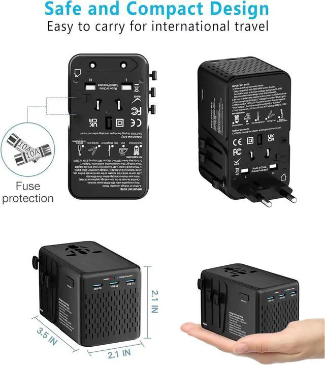 It is suitable for electrical appliances with a power of 26 - 880 W and a maximum power of 2000 W in 240 V adapter mode which is ideal for steam irons hairdryers kettles blenders (Note: please pay attention to the appliance labeling before use to ensure your safety and health. ) Translated with DeepL. com (free version) [SAFETY CERTIFICATIONS] - FCC CE and RoHS certified safety system with 1 main fuse and 3 spare fuse if theres abnormal usage The short-circuit and surge protection systems automatically shut down the power complete protection and your devices Take this travel converter and ready for a easy trip[Comes with travel bag compact size] - Designed for international travel it also comes with a lanyard and organizer bag a travel essential this travel adapter allows you to charge up to 5 devices at the same time including 3 USB-C ports and 1 USB-A port eliminating the need for multiple chargers and it's a portable outlet adapter that lets you take your charger with you wherever you go. [WORRY FREE AFTER SALES SERVICE] -Provides 24 months warranty When using the travel adapter and if theres anything wrong with the adapter please feel free to contact us at any time we will offer you satisfactory solution and we will reply you within 12 hours offer best of service