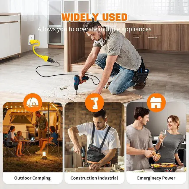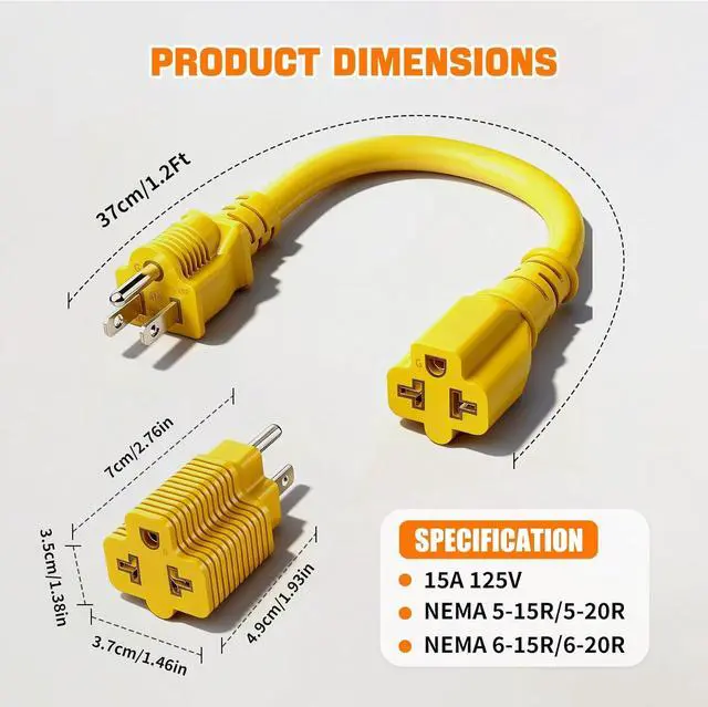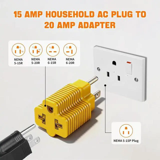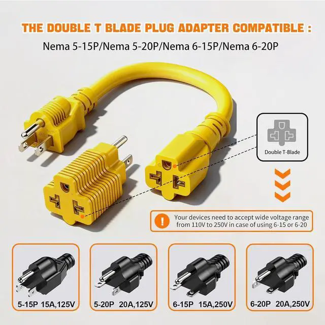 4 in 1 AC Power adapter12AWGNema 5-15P 15-AMP male 125V to Nema 5-15R/5-20R/6-15R/6-20R ac adapter (Project includes cables and adapters) 12AWG extension cord need you devices support a wide voltage range 110V to 220V15amp to 20amp plug adapter 1 foot power extension cord nema 5-15P to 6-15R 125V 15 amp male to 250V 20 amp female plug adapter cableNote: It does not convert voltages or current it just lets you connect the otherwise incompatible plugs into the 120 volt 15 amp outlet. 15A/20A 125V for America Canada marketFemale Receptacle is 15Amp & 20Amp 250Volt Comb connector. The Female Receptacle is rated at 15Amp & 20Amp 250Volt and the cable is AWG12 rated at 15A/20A 125V. 14-inch Nema 5-15P to 4-in-1 Female Adapter Cable (115A Household Plug to 6-20R T Blade Adapter Cord). Cable is very flexible and has a rugged jacket. Both male and female connectors have a reasonable amount of gripthe weight of the adapter/connectors from unplugging when the outlet is mounted on a vertical wall.