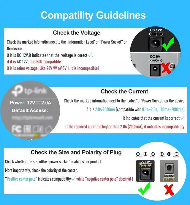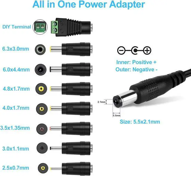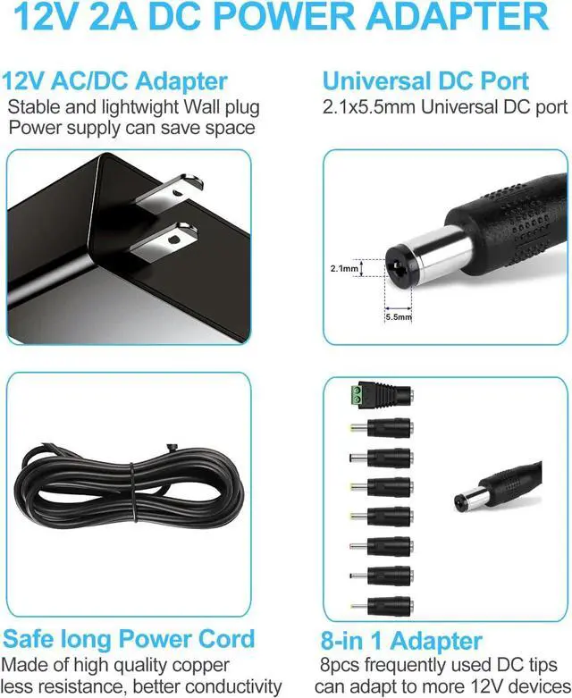 [Extensive Compatibility]: This 12V Power Adapter Suitable for CCTV Cameras LED Strip light led tape light keyboard BT speakers GPS webcam router ADSL Cats Switches and more 12V electronics.