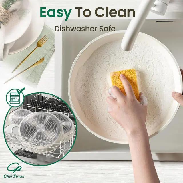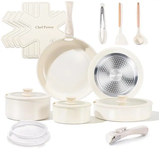 The ceramic cookware set includes 1 deep sauté pan, 2 saucepans, 2 frying pans, 2 detachable handles, 3 silicone lids, 3 silicone utensils, 4 pot protectors, and 2 sealing lids. This cookware set features a healthy ceramic non-stick coating inside and out, free of toxic PFAS, PFOA, and PTFE. It is easy to clean and dishwasher safe. The set is compatible with all stove types, including electric, induction, gas, and ceramic, as well as ovens and broilers (up to 550°F). With its stylish design and flexible removable handles, the ceramic cookware set is not just limited to cookwareit can also be used as bakeware, tableware, and storageware. Additionally, this set offers a solution to storage issues, with a stacked size as compact as 13 x 12 x 8 inches, reducing space by up to 70%.