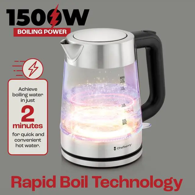 Powerful 1500 W rapid-heat technology brings up to 1.7 liters of water to a full boil in under 3 minutes or for a large cup of coffee in under 60 seconds faster than a stovetop and more efficient than standard kettles. Perfect for brewing tea, French press coffee, instant soups, oatmeal, or any quick meal when time and taste matter most.