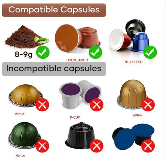 VERSATILE COMPATIBILITY: Works with both coffee grounds and capsules (small/large), offering flexible brewing options for your preferred coffee type