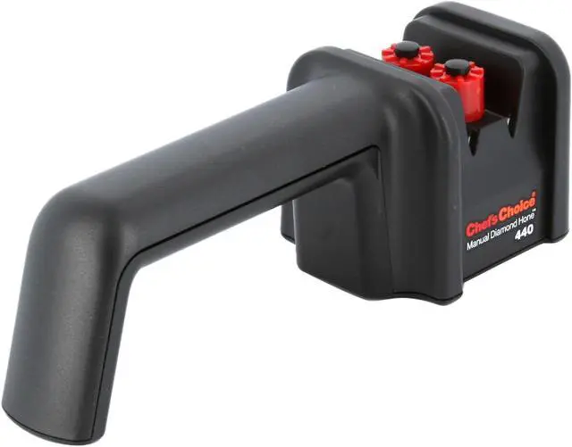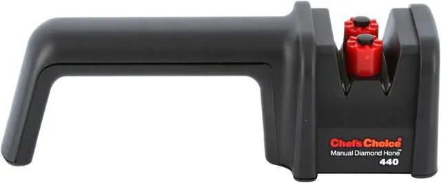 The Chef'sChoice 440 Manual Diamond Hone Knife Sharpener is a two-stage manual sharpener that uses 100% diamond abrasives to sharpen and hone knives.