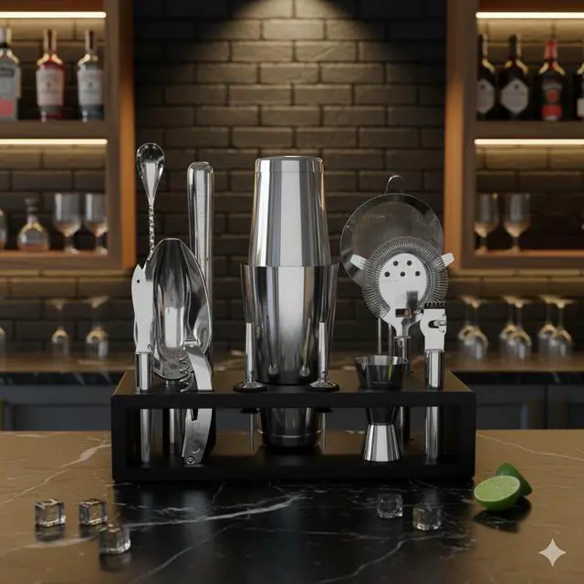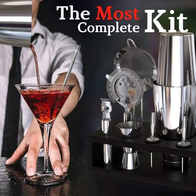 Highball and chaser bartending kit. All bar accessories for drinks. complete bar set for pro bartending and amateur drink makers. Best bar tools made from stainless steel materials. Great silver bar tools colors and black bamboo stand.