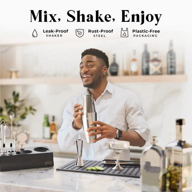 A Bar Mixing Set that sets you apart! 's 14-piece alcohol mixer shaker set contains all the bar essentials you may need in starting your newfound passion: a Boston shaker, muddler, Japanese jigger, bartender spoon, Hawthorne strainer, fine mesh strainer, corkscrew & bottle opener, ice tongs, 3 liquor pourers, and a pourer cleaner brush. To put all of these awesome cocktail tools together, our bar shaker set comes with a nicely varnished, modern wooden stand made of durable bamboo that is worthy of owning a space in your home for all your guests to see! Say hello to perfectly fitting bar set pieces with s Patent Pending muddler and bamboo stand that stands out while providing you with more convenience. We will save you from all the mess of owning cheaply-made barware tools because we only provide you with superior quality mixology essentials. All of our steel bartender tools are meticulously manufactured to provide you with a premium-quality alcohol shaker set that would not rust and would last. has always got your back in exploring and fulfilling your drink mixing passion; we will guide you throughout the way as we offer you 24/7 VIP Service to assist whenever you need it.