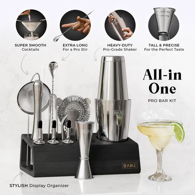| Included Components | 28oz Boston Shaker, Japanese Jigger, Hawthorne Strainer, Fine Mesh Strainer, Muddler, Corkscrew Bottle Opener, 3 Liquor Pourers, Liquor Cleaner Brush, Ice tongs, Mixing Spoon, Bamboo Organizer Stand, 35 Recipe Cards, Silver Color Tools with a Black Color Stand |