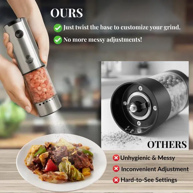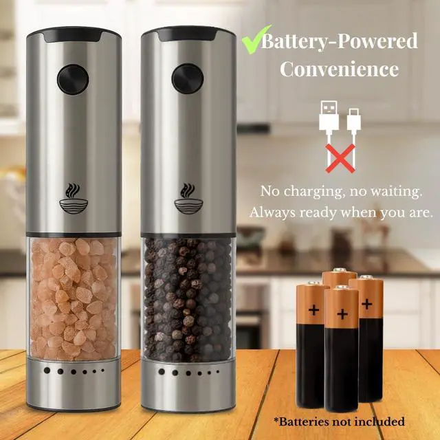 ONE-TOUCH BATTERY-POWERED CONVENIENCE: This battery operated salt and pepper grinder set lets you season with one hand. Powered by 4 AAA batteries (not included), these automatic mills deliver consistent performance, perfect for home chefs, seniors, or busy cooks looking for effortless kitchen accessories and home essentials.
