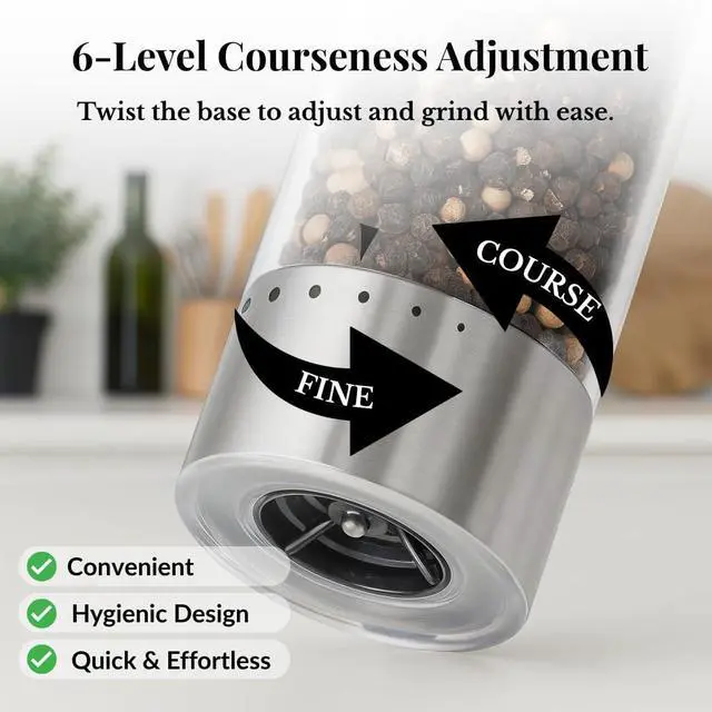 6-LEVEL COARSENESS ADJUSTMENT: Customize your seasoning with 6 grind levels from fine to coarse black pepper or coarse salt for grinder use. The external bottom dial allows quick, mess-free adjustments without opening the grinder, making this electric salt and pepper grinder set ideal for cooking essentials, dining, and countertop use.