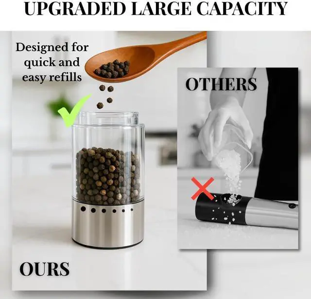 LARGE 95ML CAPACITY & EASY REFILL: Transparent chambers hold up to 95ml of salt or pepper, reducing frequent refills and letting you monitor spice levels at a glance. Refillable battery operated mills keep your cooking seamless while adding style to your countertop and home essentials for new home chefs.