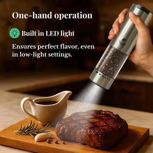 BRIGHT LED LIGHT FOR ACCURATE SEASONING: Each electric salt pepper grinder set features a built-in LED light that automatically activates during use. Measure spices precisely in dim kitchens, outdoor BBQs, or romantic dinners. A modern kitchen gadget essential for housewarming gifts or new home kitchen accessories.