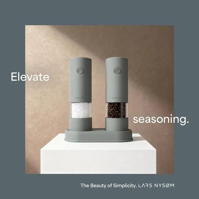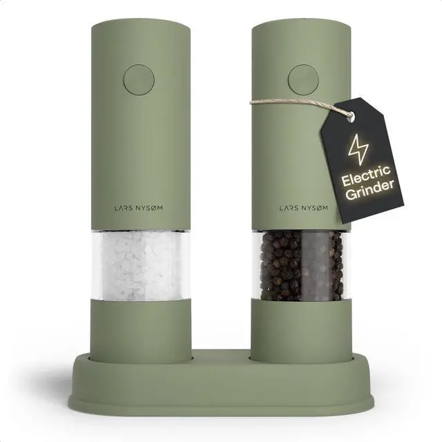 The "Kryd" electric salt and pepper grinder set consists of two grinders and a matching coaster. The AAA batteries required for operation (4 per grinder) are not included; these must be purchased separately.