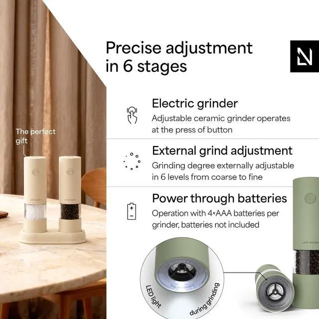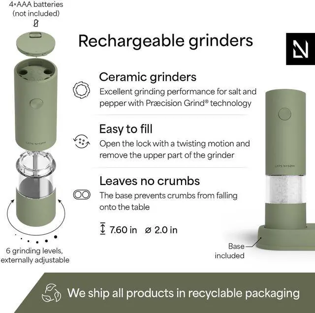 The grinders have a Præcision Grind ceramic grinder with an externally adjustable grinding degree in 6 stages. They can be operated with one hand at the touch of a button. Each grinder is powered by 4 AAA batteries (not included).