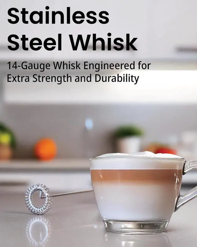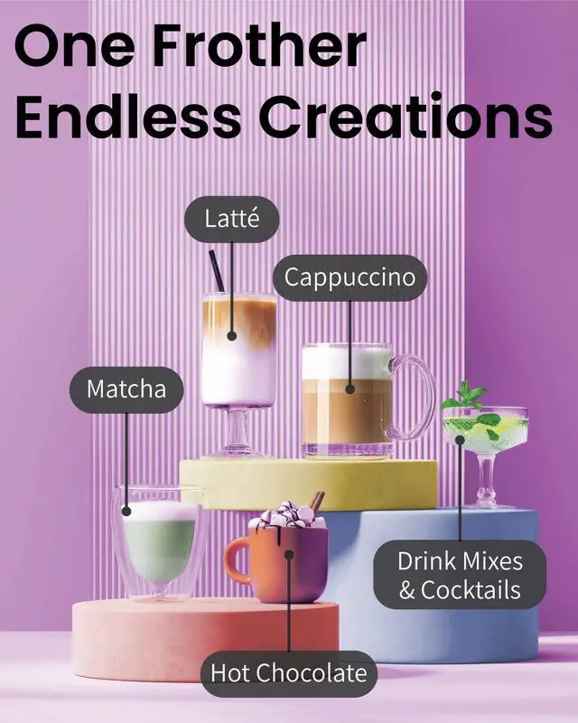 Froths hot or cold milk for lattes, cappuccinos, and macchiatos. Blends matcha, cocoa, protein shakes, and more - one tool for all your drinks!