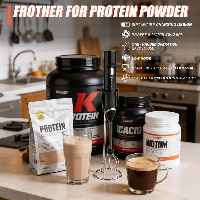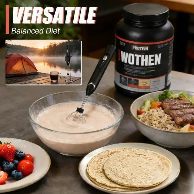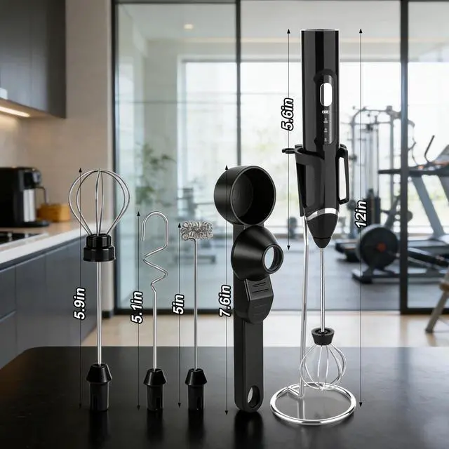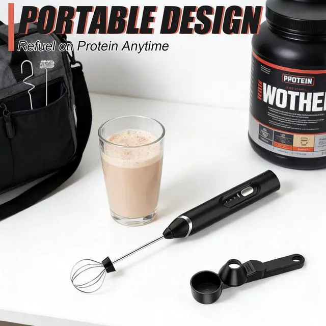 4-In-1 Protein Mixer Combo: Your All-In-One Solution Simplify Your Routine: 4-In-1 Protein Mixer Combo If your kitchen or gym bag is cluttered with separate measuring tools, blenders, and frothers, our 4-in-1 combo is the solution, pairing a precision protein scoop funnel with a powerful electric protein powder mixer wand to turn four bulky tools into one compact, efficient system, crafted for coffee lovers, fitness enthusiasts, and busy cooks who want to save time, money, and space without sacrificing performance; the protein scoop funnel is your all-in-one measuring heromore than a basic protein powder scoop, it combines accurate measuring, mess-free portioning, and smooth pouring in a food-grade design, letting you scoop protein powder for post-workout shakes, coffee grounds for lattes, or baking flour for treats with no spills, over-pouring, or extra cleanup, plus its clog-free spout works with fine and thick powders alike and detaches in seconds for rinsing; paired with the electric protein mixer wand, this set delivers café-worthy and gym-ready results in 30 secondsthis isnt just a protein shake blender electric, press the button and its robust motor whips up lump-free protein shakes, smoothies, or meal replacements, and swapping to the frothing attachment turns it into a top-tier frother for protein powder that creates creamy foam for cappuccinos, hot chocolate, or vegan oat milk lattes, with quiet operation letting you prep at home or the office without disruption; why buy four tools when one does it all? This combo replaces a measuring spoon, funnel, manual whisk, and standalone frother, cutting your costs and halving storage space, while the included metal stand keeps the protein mixer wand organized on countertops and its lightweight design makes it a perfect