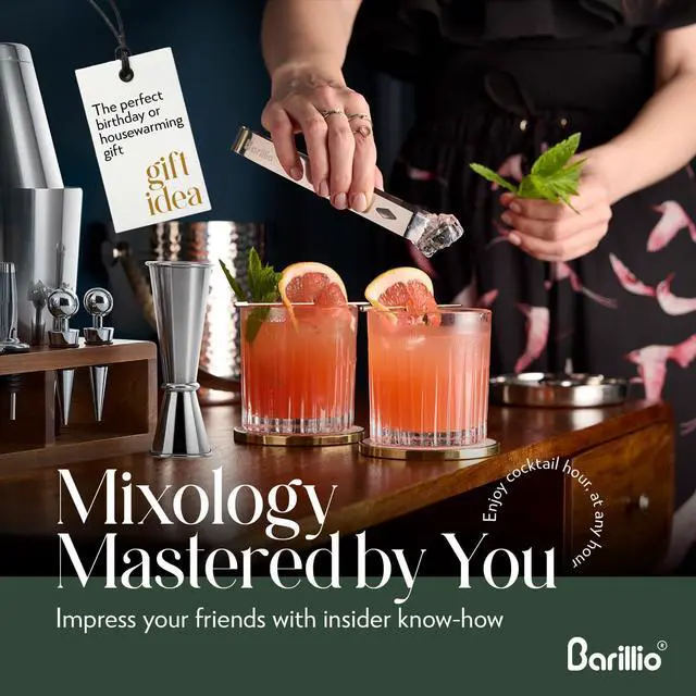 | Included Components | Cocktail Shaker, Hawthorne Strainer, Jigger, Bar Spoon, Muddler, Bottle Opener, Velvet Carry Bag, Bamboo Stand, Recipes Booklet, Stainless Steel Filter, Cleaning Brush, Ice tongs, Stirrer, Stir sticks, Cocktail Umbrella, Wine Bottle Covers, Whiskey stones, Wood chip, Cocktail Smoker, Pour Spouts, Measuring Cup, Liquor Dispenser, Wooden pestle |