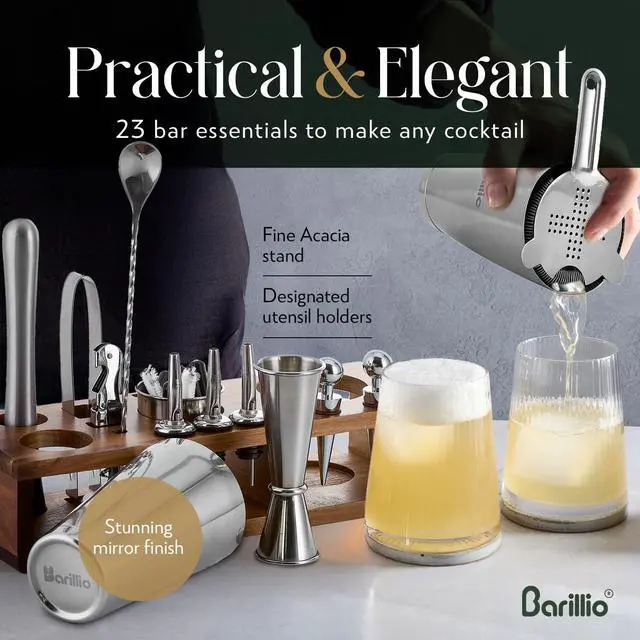 Build a beautiful home bar in minutes with the bartender kit. This 23-piece cocktail shaker set gathers professional bar accessories in a polished Acacia stand that saves space and keeps everything within reachno rummaging through drawers. Each tool is crafted from food-grade SS304 steel for durability and clean flavor, making the set a reliable bar set for nightly use or weekend entertaining. Inside the bartender set youll find the essentials: shaker, double jigger, muddler, Hawthorne strainer, spiral spoon, ice tongs, pourers and more, plus a step-by-step booklet so first-time hosts can pour confidently. The stand stages every piece for quick service, turning this into a practical mixology bartender kit that looks as good as it performs. Whether youre upgrading your apartment cart or outfitting a new home, this versatile bartending kit functions as a complete cocktail kit and a handsome display.