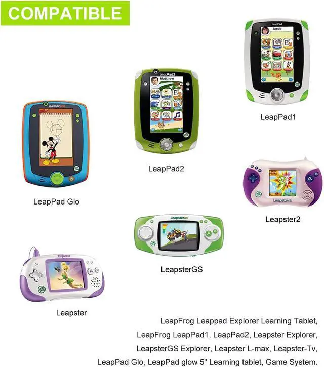MCompatible with: LeapFrog Leappad Explorer Learning Tablet LeapFrog LeapPad1 LeapPad2 Leapster Explorer LeapsterGS Explorer Leapster L-max Leapster-Tv LeapPad Glo LeapPad glow 5 Learning tablet Game
