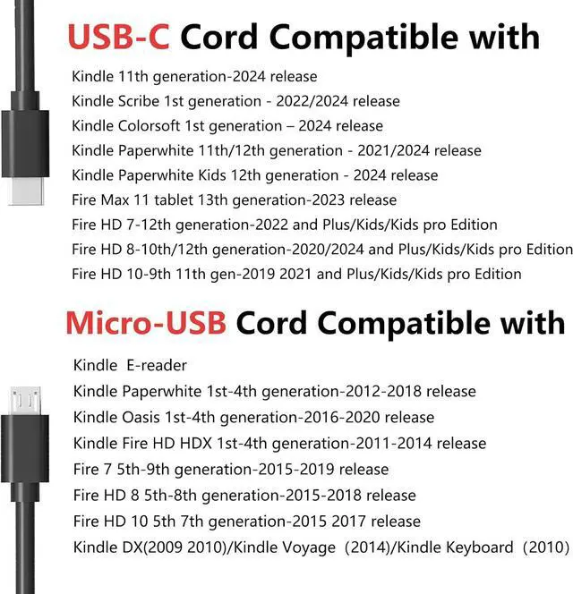 Kindle E-Readers: All Fire 6 Fire 7/Kids Fire HD 8/8Plus/Kids/Kids Pro Fire HD 10/10Plus/Kids/Kids Pro and All Kindle/Kids Kindle Paperwhite /Kids Kindle/Oasis Colorsoft Scribe Kindle Voyage E-Readers Fire Phone Fire TV Stick and other USB-C and Micro