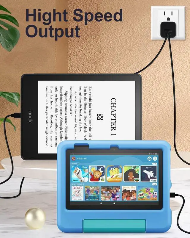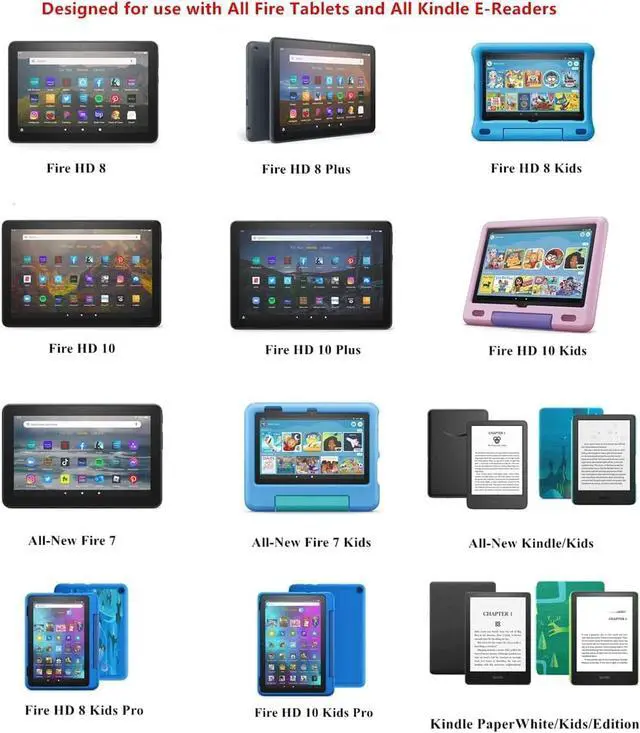 Kindle E-Readers: All Fire 6 Fire 7/Kids Fire HD 8/8Plus/Kids/Kids Pro Fire HD 10/10Plus/Kids/Kids Pro and All Kindle/Kids Kindle Paperwhite /Kids Kindle/Oasis Kindle Voyage E-Readers Fire Phone Fire TV Stick and other USB-C and Micro USB Devices. for Fire HD 8 8Plus Tablet (10th-12 Gen 2020-2022 Release) All-new Fire HD 7 tablet(12th gen-2022 release) Its 45% faster charging than the in-box power adapter. and for Fire HD 10 10Plus tablet (9-11th Gen 2019-2021 Release) Its 27% faster charging than the in-box power adapter. Ultra-compact lightweight sleek design( 1.28 x 1.18 x 1.18 ) compact and easily portable perfect for home travel office and business trip. ModelHTY-0503000.