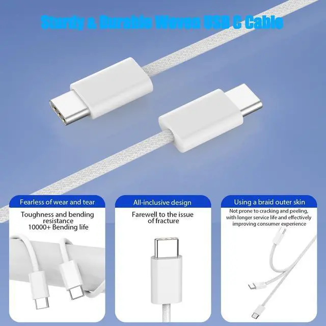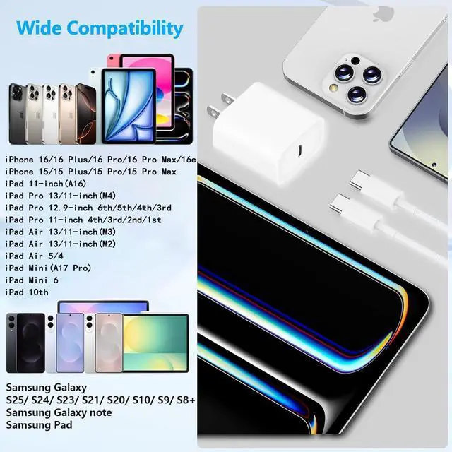 USB C to C woven Cable also compatible with more USB C devices.? What you get 2Pack 20W USB C Charger Blocks and 2Pack 6Foot USB C to USB C Cable(iPhone 16/15 New braid woven cord). We are very confident in the long-lasting performance of the certified USB C iPhone wall charger and power cord. If you have any questions about the product contact our customer service and we will solve your problem within 24 hours
