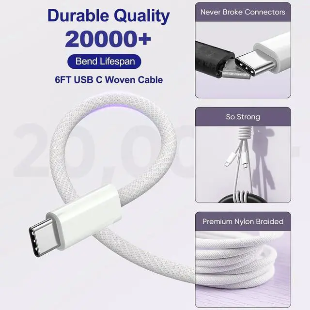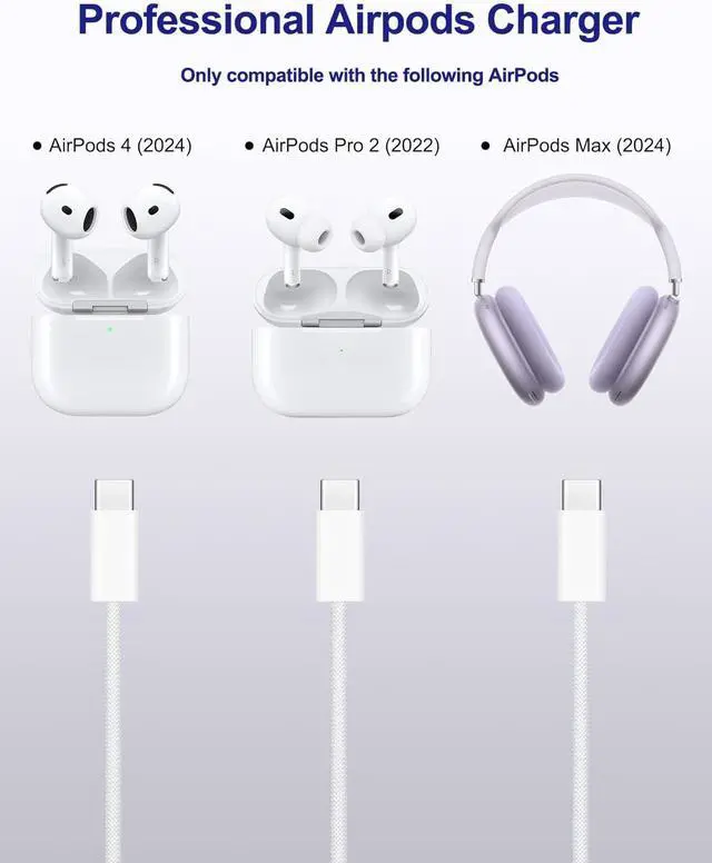 20W Fast Charger AdapterThis 20W USB C Fast charger offers a fast charging experience of up to 20W for AirPods Pro (3rd generation) AirPods Pro (2nd generation) and AirPods 4 AirPods Max 2 (2024 Release). AirPods Charger Fast ChargingDesigned for AirPods 4 AirPods Pro (3rd generation) AirPods Pro (2nd generation) AirPods Max 2 (2024 Release). The charger also supports iPhone 17/16/15 All series iPad2018-2025 or other type c device Fast Charging. 6FT Woven USB-C Charger CableThis 20W PD charger comes with a 6-foot (2-meter) usb c to usb c charging cable that gives your device more room to move while charging fast and you can work and charge over longer distances.