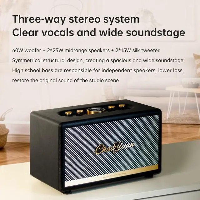 Three-way Stereo System: Equipped with a 60W woofer, 2 * 25W midrange speakers, and 2 * 15W silk tweeters, its symmetrical structural design creates a spacious and precise soundstage. High, mid, and low frequencies are handled by independent speakers, reducing loss and faithfully reproducing original studio sound.