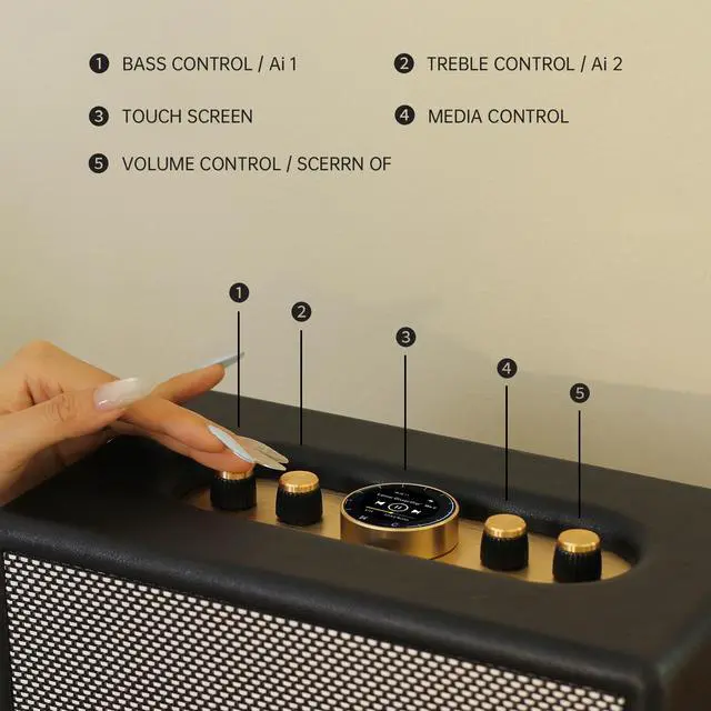HD Touch Screen & Classic Control: Features an HD touch screen for fast switching between network, Bluetooth, and RCA input modes. The metal knob allows gentle twisting to change programs, replicating the tactile feel of a classic radio.